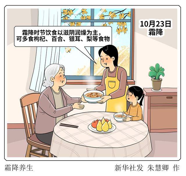 10月23日是霜降节气。北京中医医院医生王雷永介绍,霜降是秋季最后一个节气。此时,自然界阳气渐藏,寒气渐长,养生应注重护阳防寒、调和脾胃,可以多吃山药、百合、萝卜等健脾食材,为入冬做好准备。