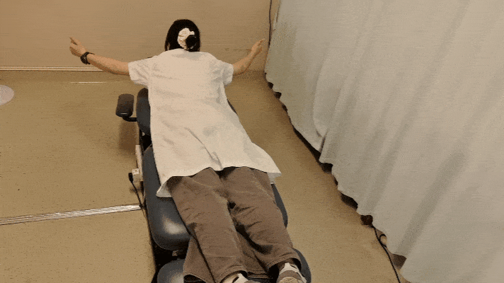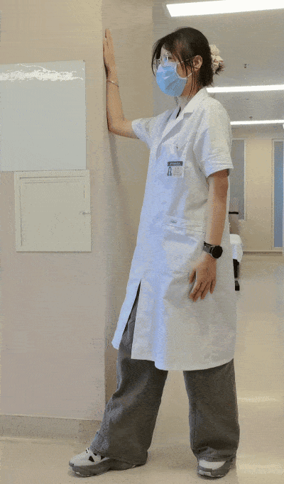 ②手臂相对固定,身体缓慢向前倾,感受胸肌的牵拉感,此过程中避免耸肩;