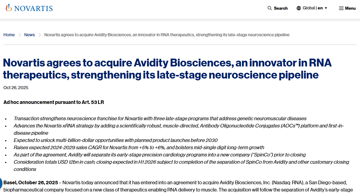 诺华官网消息,近期诺华宣布收购RNA治疗领域的创新公司Avidity Biosciences,并推出了三个针对遗传性神经肌肉疾病的后期项目。交易总计120亿美元,预计在2026年第一季度完成交割。