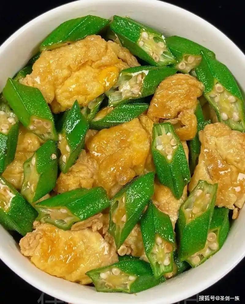 3 油热爆香葱蒜,倒入秋葵翻炒,淋入鸡蛋液,煎定型再炒散。