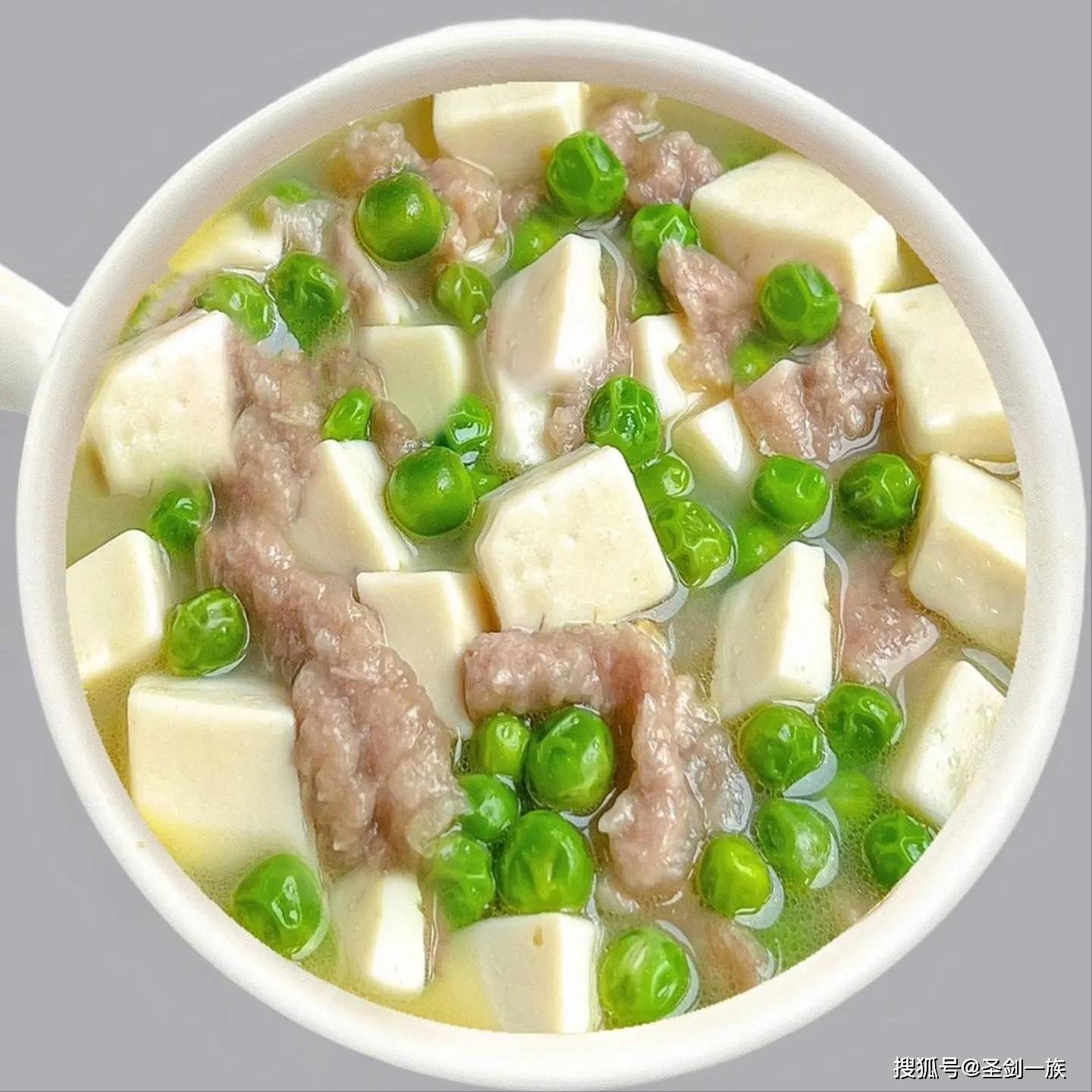 鸡蛋2个、豌豆适量、嫩豆腐1块、猪肉丝适量、葱、姜少许、盐适量、红薯淀粉少许。