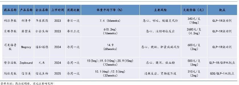 国内已获批减重适应证的5款GLP-1类药物。界面新闻截自国元证券研报