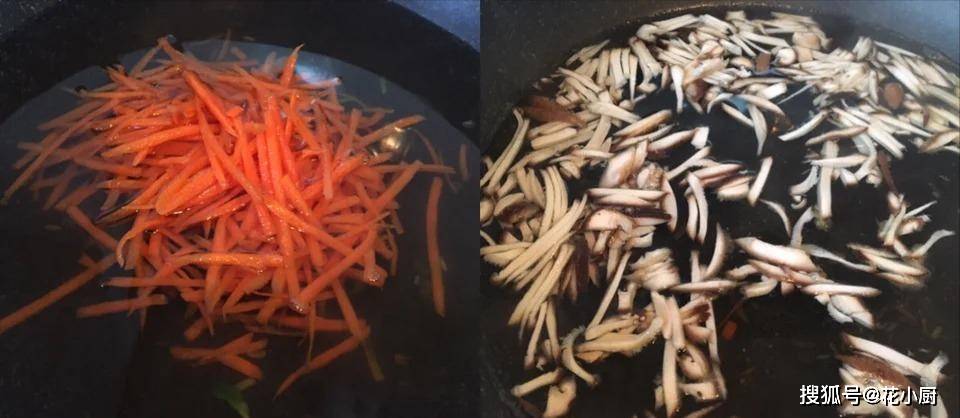 4、胡萝卜丝和香菇丝也不能落下,同样得放锅里焯下水,然后捞出来备用。
