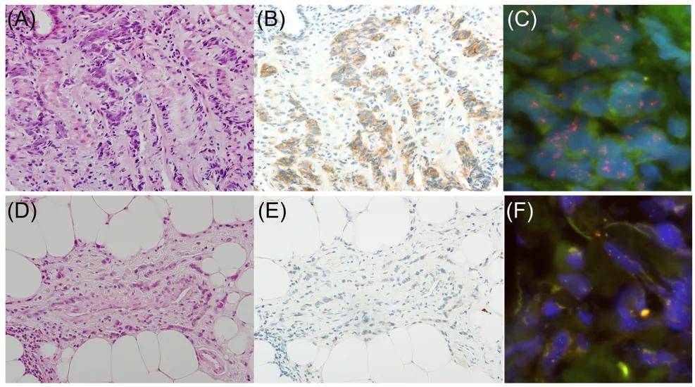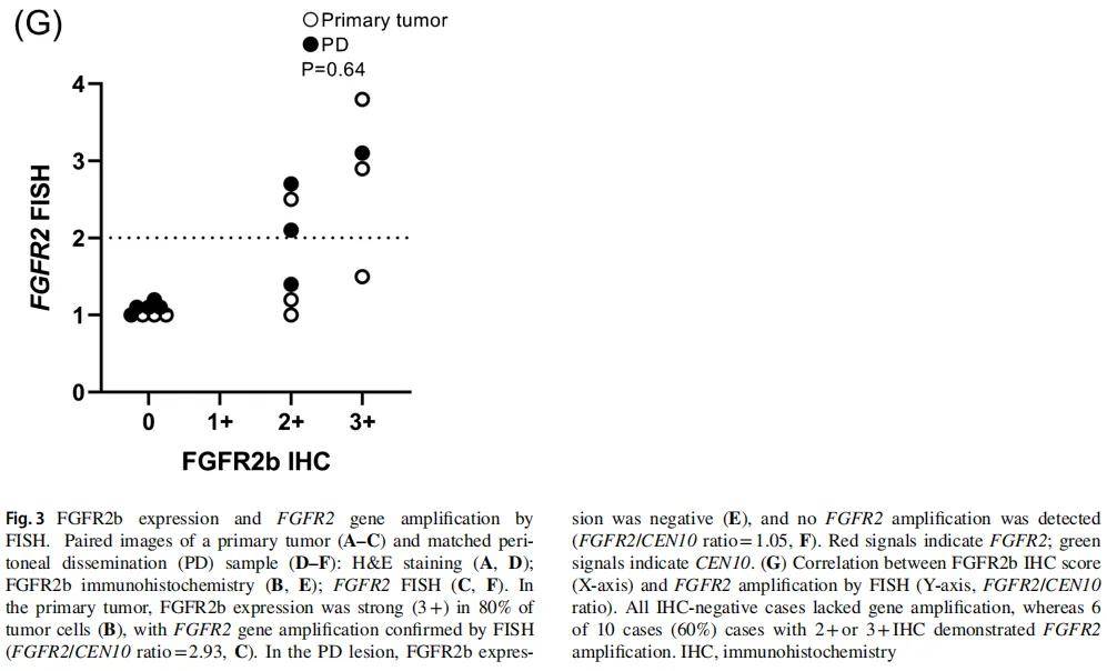 图3A-F展示了FGFR2b免疫组织化学与FGFR2 FISH检测的代表性图像。在原发肿瘤或PD中任一部位FGFR2b表达阳性的9例患者中,10份组织标本(6份原发肿瘤、4份PD样本)为FGFR2b阳性,8份为阴性(3份原发肿瘤、5份PD样本)。对所有18份标本均进行了FISH检测(图3G)。