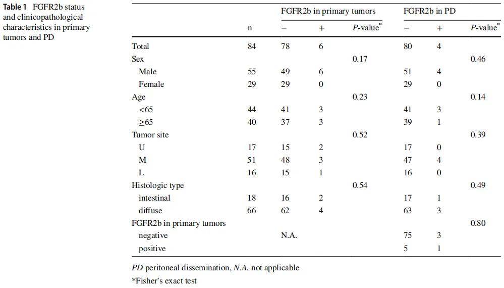 总之,据研究者所知,本研究是首个针对一系列PD阳性胃癌评估FGFR2b状态的研究,尤其聚焦于原发肿瘤与PD组织的对比分析。鉴于FGFR2b表达在原发肿瘤与PD之间存在空间异质性且一致性较低,同时检测两个部位的FGFR2b状态可能有助于更精准地筛选适合FGFR2b靶向治疗的患者。