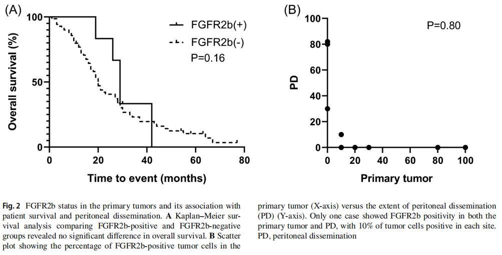 Kaplan-Meier分析显示,FGFR2b阳性与阴性肿瘤患者的总生存期(OS)无显著差异(图2A)。