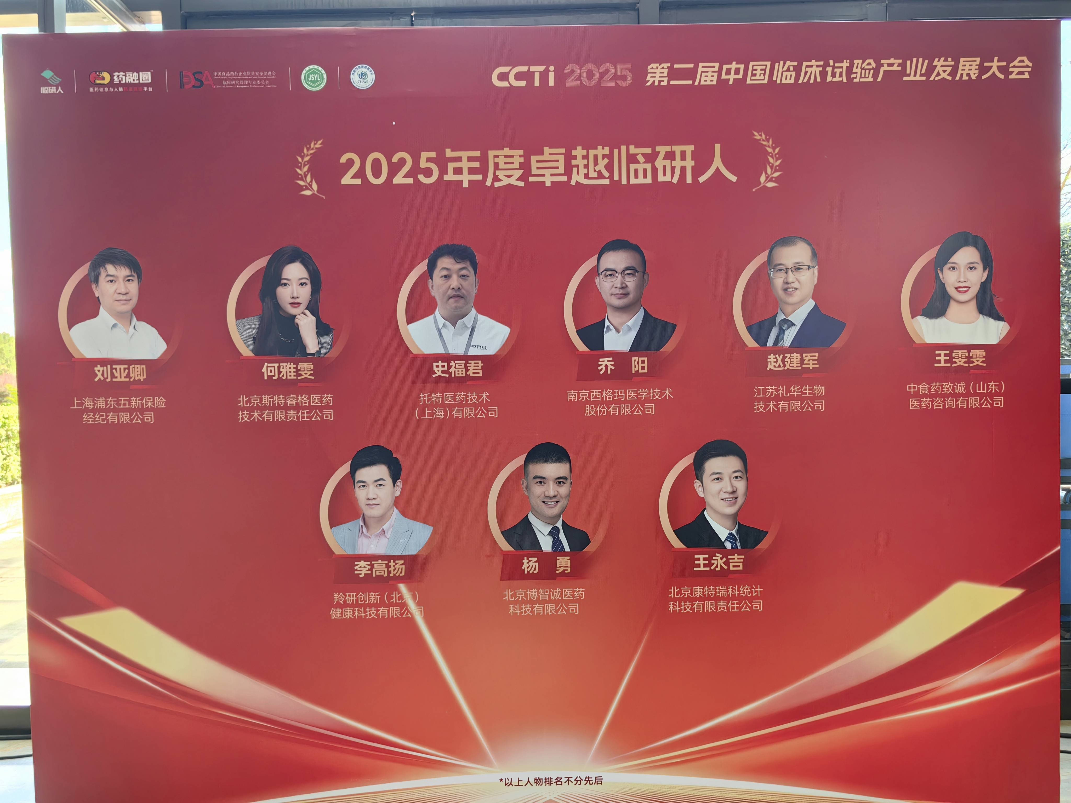 南京西格玛医学临床总监乔阳受邀参加CCTI第二届中国临床试验产业大会,并被评为2025年度卓越临研人。