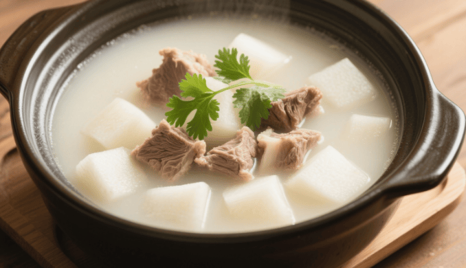 出锅前加盐、白胡椒粉调味,撒上香菜,
