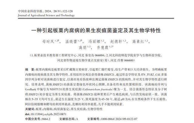 [1]母时风.一种引起板栗内腐病的果生炭疽菌鉴定及其生物学特性, 中国农业科技导报, 2024-09-15