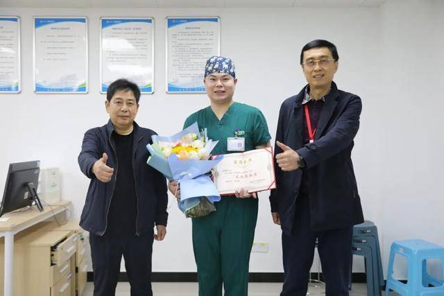 随后,汤建国书记与邹晓院长一同上前,郑重递上“红医榜样证书”与慰问金。红色证书封面熠熠生辉,“红医榜样”四字苍劲有力,既是对谭智鑫两次捐献善举的最高肯定,更是对他以党员身份践行红医精神、坚守医者使命的表彰。董彩梅副院长则捧着娇艳的鲜花与精心准备的慰问品走来,花香与暖意交织,让科室里的氛围愈发温馨,也让这份荣誉多了几分动人的温度。