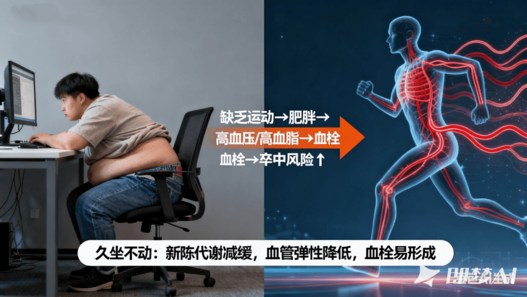 缺乏运动。现代年轻人久坐不动成常态,工作对着电脑,下班瘫在沙发。缺乏运动使新陈代谢减缓,脂肪堆积、体重增加,进而引发肥胖。而肥胖是高血压、高血脂、糖尿病等慢性病的重要诱因,这些疾病都会提高中风发生几率。此外,长期不运动还会让血管弹性降低、血液循环不畅,容易形成血栓。