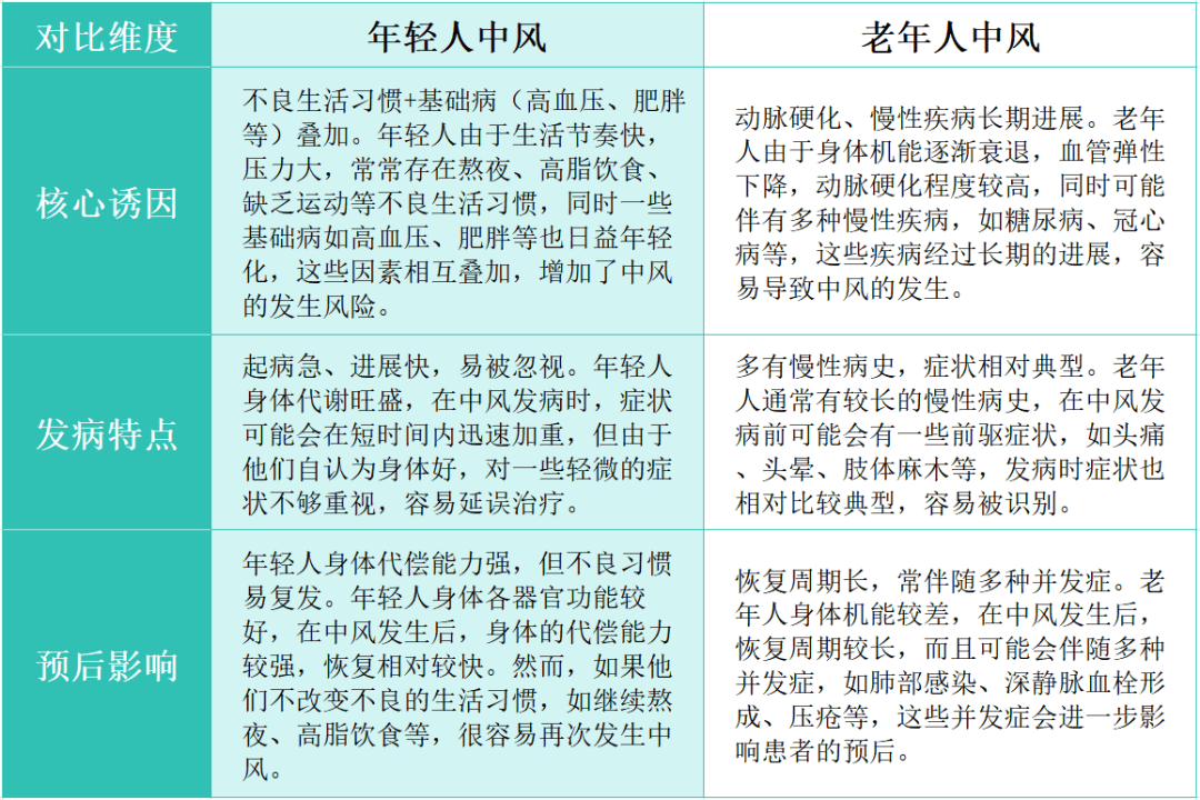 为打破年轻人对“中风仅为老年病”的认知误区,帮助年轻人更好地认识自身面临的健康风险,聂伟从核心诱因、发病特点、预后影响三个维度对年轻人中风和老年人中风进行对比: