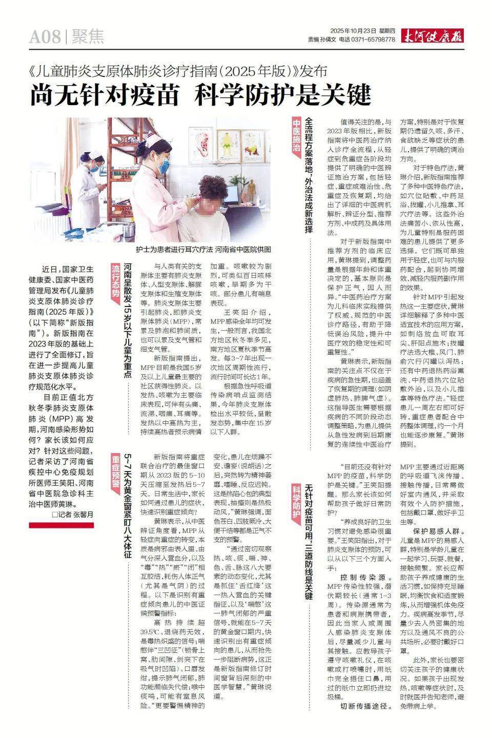 日前,国家卫生健康委、国家中医药管理局发布《儿童肺炎支原体肺炎诊疗指南(2025年版)》(以下简称“新版指南”)。