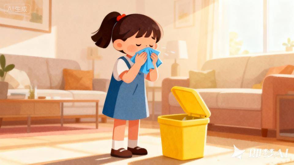 应教导孩子遵守咳嗽礼仪,在咳嗽或打喷嚏时,用纸巾完全捂住口鼻,用过的纸巾立即扔进垃圾桶。