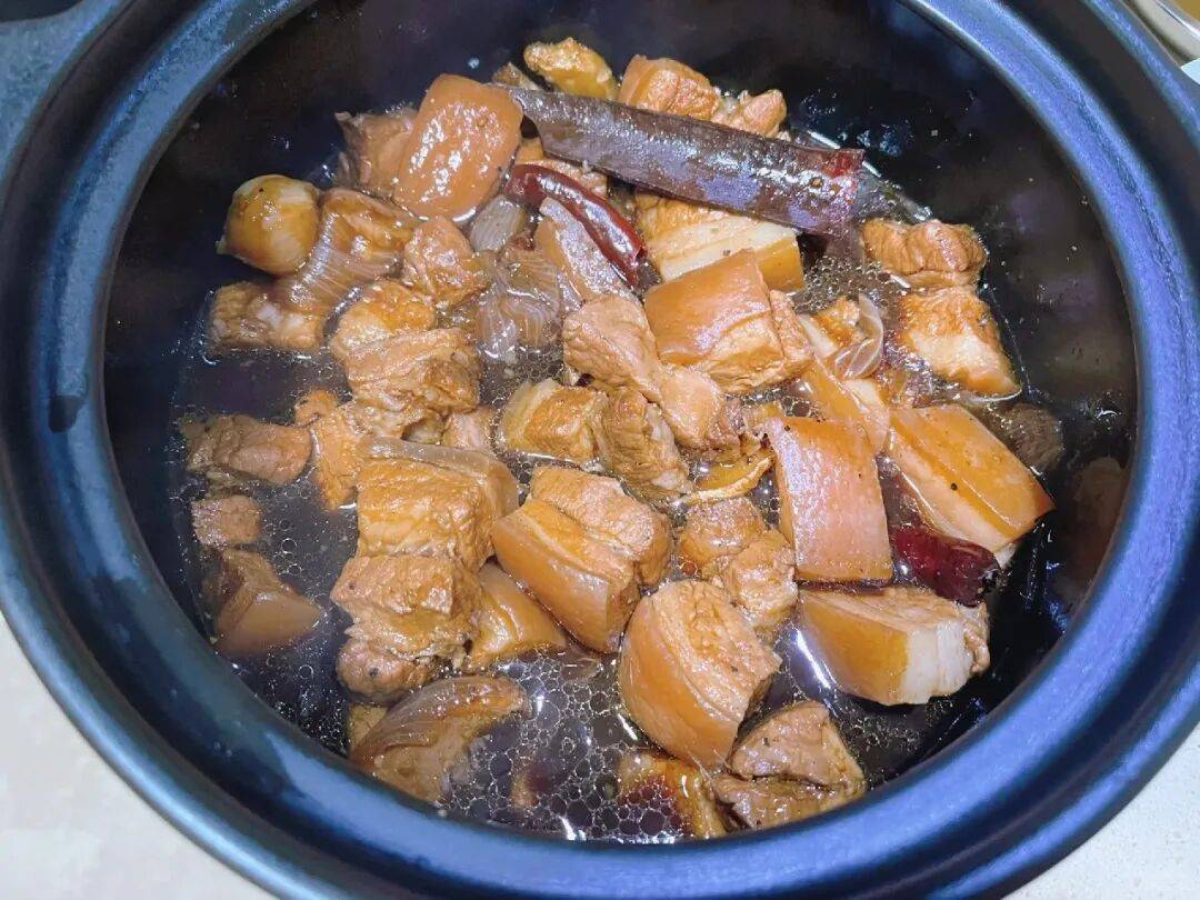 3.炖煮:砂锅加水放肉、姜、葱,大火煮开转小火炖40分钟(牛肉1小时),肉软后加肉桂再炖10-15分钟,加生抽调味。