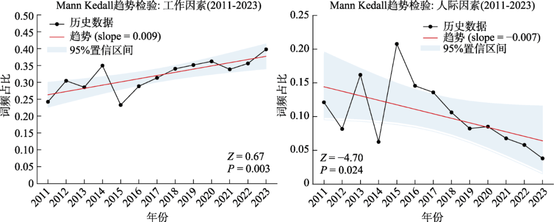 曾经,比工作内容更累的是人际关系,处理不完的“人情世故”,给本就疲惫的高压力工作人群“雪上加霜”。而站到时间轴长河里,课题组发现了更耐人寻味的变化。通过对2011—2023年间的文本数据进行年代分析,发现工作因素的影响占比一路攀升,人际因素却呈下降趋势。这是啥意思呢?以前说起情绪内耗,“和同事闹矛盾”“被领导穿小鞋”这类人际纠葛常是绕不开的话题;可现在,“活干不完”“绩效压力大”“行业卷到没边”成了更扎心的痛点。工作的“快节奏、高负荷”逼得高压力工作人群没有精力和心思来应对多余的人际关系,这种变化也让“干活”成了如今高压人群情绪消耗里更突出的那根“引线”。