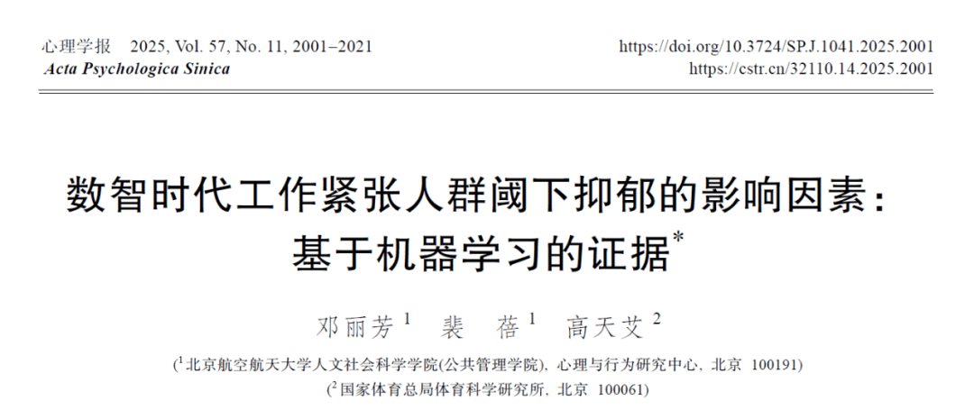 邓丽芳, 裴蓓, 高天艾. (2025). 数智时代工作紧张人群阈下抑郁的影响因素:基于机器学习的证据. 心理学报, 57(11), 2001-2021.