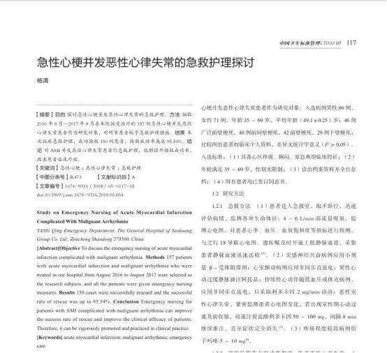 [1]杨清.急性心梗并发恶性心律失常的急救护理探讨[J].中国卫生标准管理,2018