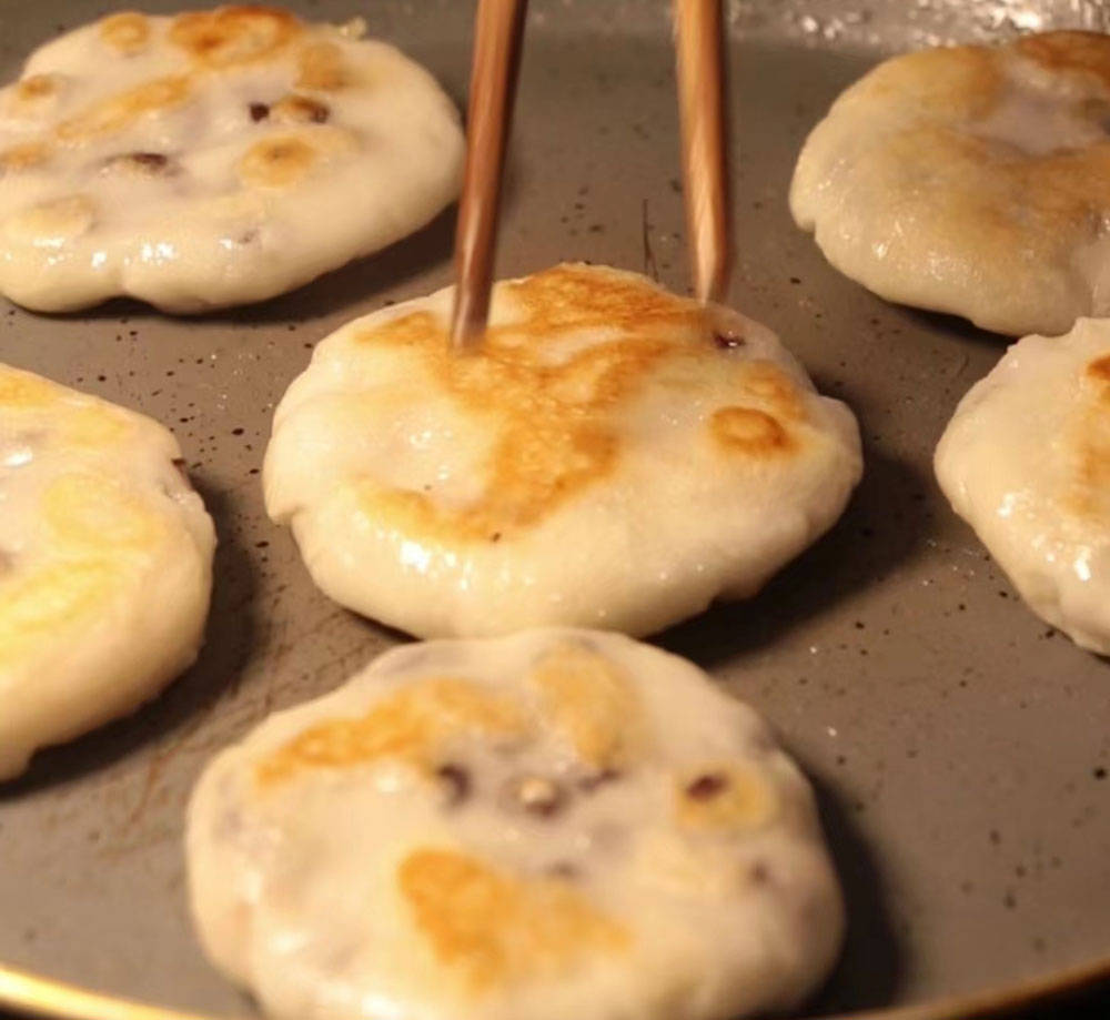5、不粘锅来煎,里边刷点油,其煎出来更焦黄,火候不要太大,中等慢煎,一两分钟后翻面一次,看起来透明了,就熟了。