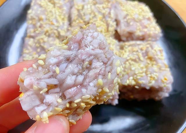 3、关火后趁热撒上一层白芝麻,用铲子背面轻轻压实,稍微晾凉一会儿,等到不烫手的时候,倒扣在案板上,切成自己喜欢的大小块状,就可以开吃啦。