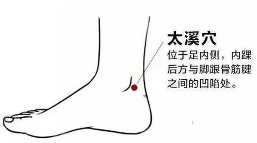 按摩方式:早晨起床后或睡前,坐于床上,用手掌大鱼际或 小鱼际来回搓擦太溪穴,直至局部发热发胀。