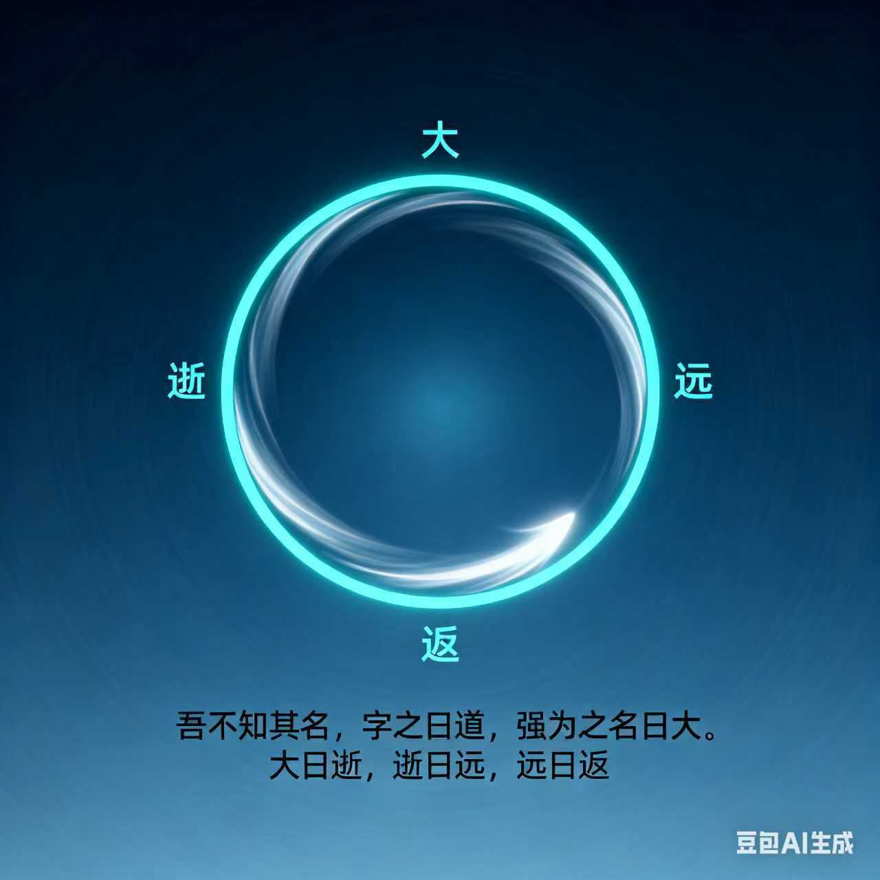 【道的命名】老子曰:“吾不知其名,字之曰道,强为之名曰大。大曰逝,逝曰远,远曰返。” 这句话的核心是:万物运行的规律客观存在,但它无形无状、难以描述,老子不知如何为它精准命名,只能勉强给它取个 “字” 叫 “道”,再勉强形容它的特性为 “大”。这里的 “大”,并非单纯指空间尺度的 “庞大”,而是体现道的 “深远” 与 “变幻”—— 它涵盖万物、包容一切;“逝”,可理解为 “延伸”,道无处不在、无远不至,能穿行于古往今来的时间维度,也能覆盖八荒六合的空间范围;“逝曰远”,是说道能延伸至极远之处;“远曰返”,则是说道在抵达极致后,又会回归事物的根本。这是老子对 “道” 循环变化规律的另一种表达,本质上仍在强调:万物都无法逃离 “有与无” 的循环,都必须遵循自然大道。