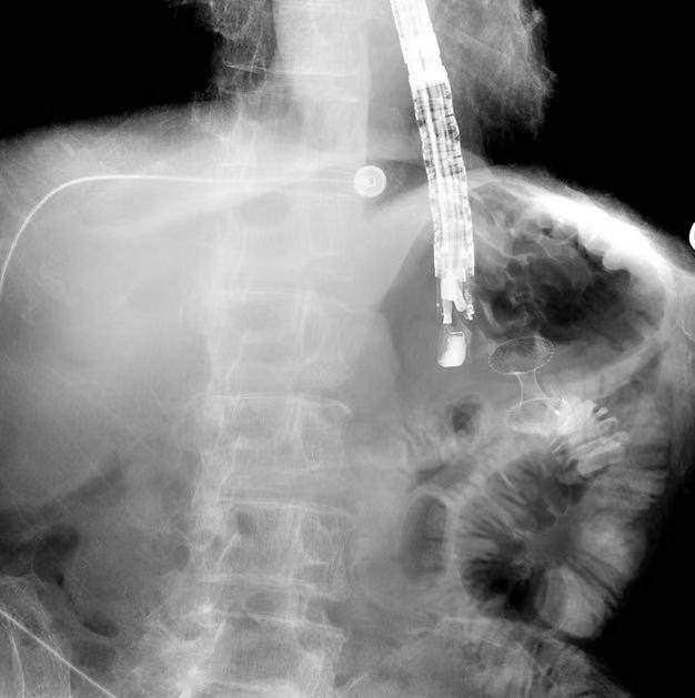 在超声引导下,团队操作内镜精准定位到紧贴胃壁的空肠,通过特制的穿刺针,从胃内直接穿刺进入空肠,随后“释放”核心器械——一种特殊的“双蘑菇头”样金属支架。