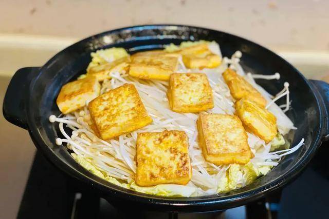 7.砂锅炖豆腐:准备一个砂锅,依次放入白菜、粉丝、金针菇和煎好的豆腐,再淋上之前调好的酱汁,盖上砂锅盖子炖煮三到五分钟即可;
