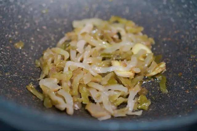 3.炒香榨菜丝:热锅烧油,油温7成热时,把榨菜丝倒进去,翻炒均匀出香味;