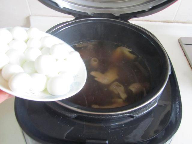 3. 还剩下20分钟时加入煮熟去壳的鹌鹑蛋, 再还剩下五分钟时加入泡软的粉丝;