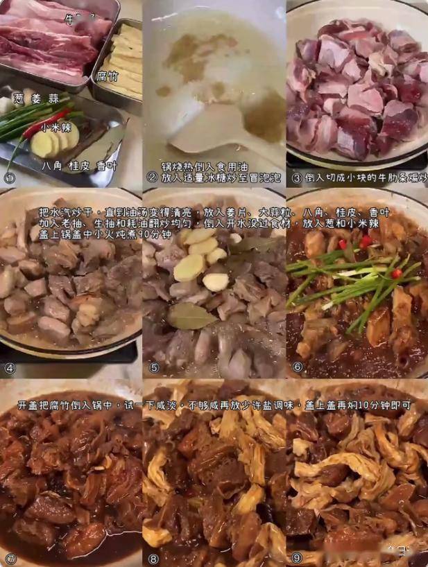 材料:适量牛肋条,葱姜蒜,适量腐竹,小米辣,八角,桂皮,香叶,一把冰糖,老抽,生抽,蚝油,葱段,小米辣,