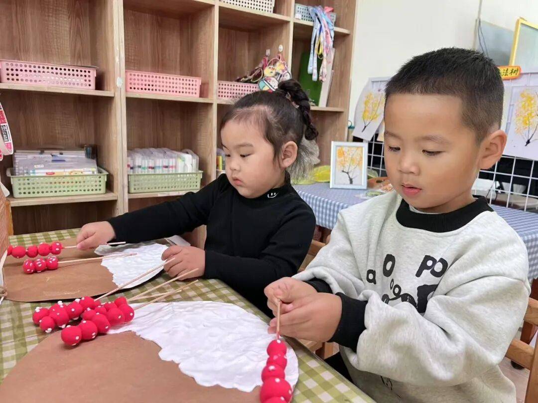 结合民间小雪时节吃冰糖葫芦的习俗,我们开展了别开生面的“手工糖葫芦”活动。在创作过程中,老师引导孩子们了解:山楂可以开胃,冰糖能够润肺。这场艺术与健康知识的奇妙碰撞,不仅锻炼了孩子们的动手能力与创造力,更让他们在缤纷的色彩中,直观感受到了“药食同源”的朴素智慧。