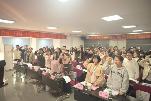 开班仪式上,湖南省药学会理事长张毕奎、秘书长朱运贵出席并致辞。张毕奎从深化医改与临床药学发展双重维度,强调了处方点评工作在促进临床合理用药和深化医改背景下的重要意义。朱运贵表示,本次培训是学会继续教育体系的重要组成部分,将作为常态化规范化项目持续推进,为全省药师队伍专业能力建设提供稳定支撑。致辞环节后,全体参训药师庄严起立,高举右拳进行集体宣誓:“我宣誓,以守护人民健康为己任,恪守药学职业准则……”誓言铿锵有力,彰显了全省药师队伍践行职业初心、护航用药安全的坚定决心。