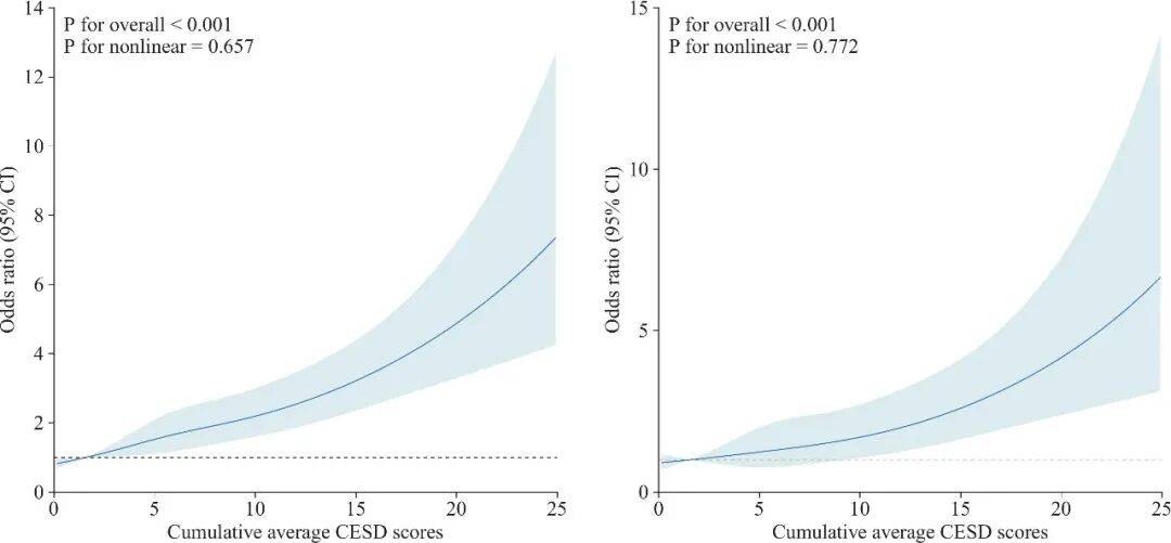 研究截图 抑郁量表得分与心脏病发作(左)和中风发病(右)之间的关联。