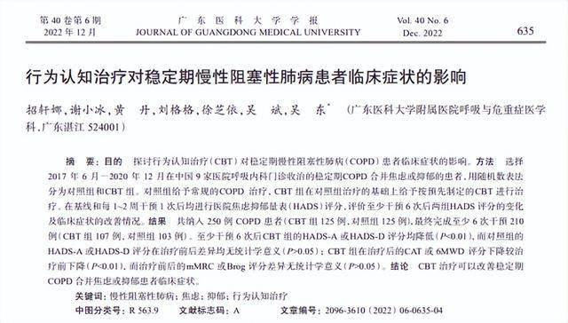 [1]招轩娜,谢小冰,黄丹,等.行为认知治疗对稳定期慢性阻塞性肺病患者临床症状的影响[J].广东医科大学学报,2022