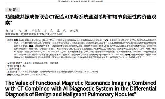 [1]杨洁,功能磁共振成像联合CT配合AI诊断系统鉴别诊断肺结节良恶性的价值观察,2024-08-25
