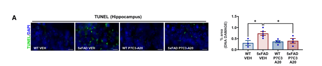 病理分析进一步支持了 P7C3-A20 的治疗效果。尽管该化合物并未改变与 Aβ 生成相关的基因表达,却显著降低了脑内淀粉样斑块的沉积。
