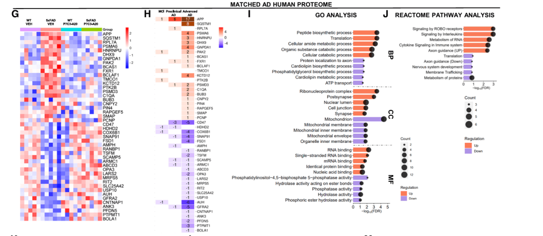 为了进一步挖掘潜在的治疗靶点,研究人员进行了一项跨物种的蛋白质组学分析。他们对比了人类 AD 大脑和小鼠大脑的蛋白质变化,筛选出了 46 种在两个物种中变化趋势一致,且在小鼠接受 P7C3-A20 治疗后恢复正常的蛋白质。
