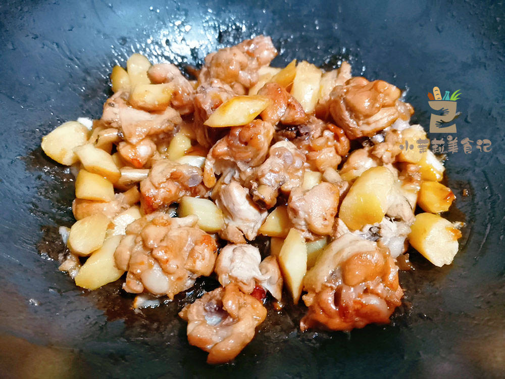 3、锅里淋一点点油,烧热后把肉倒里边,加姜片一起炒一会儿,水分烹出去,质地焦香,调些酱油进去,丢三四个老冰糖,然后添上热水浸没开始炖。