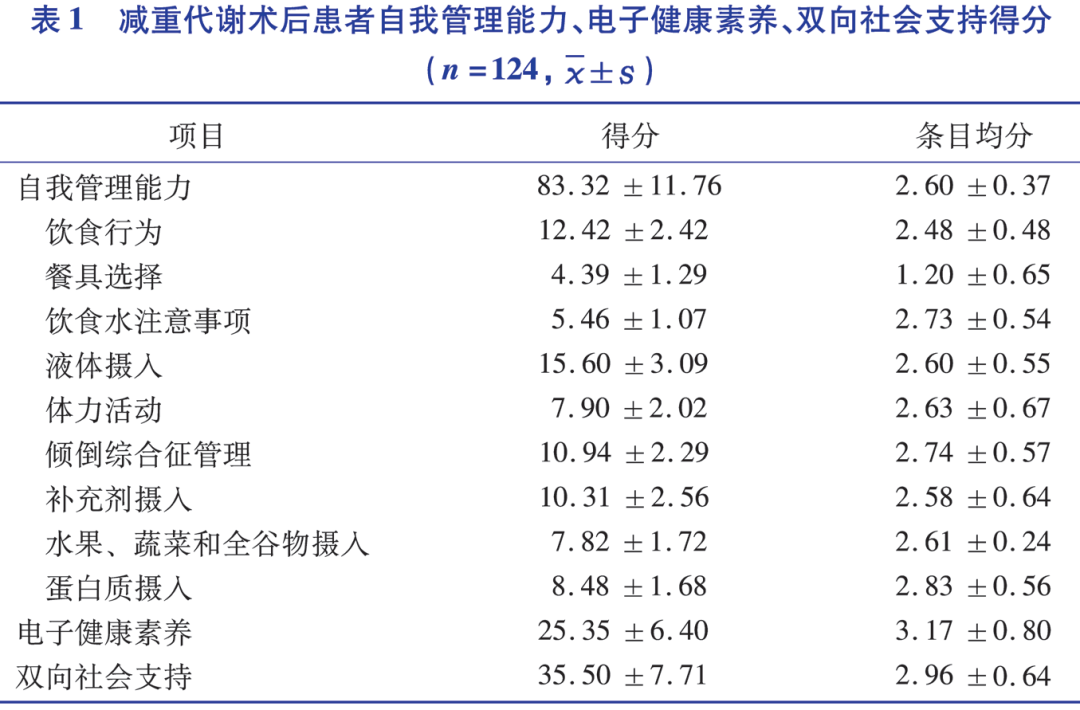便利选取2022年3月至2024年5月期间就诊于成都市某三级甲等医院并接受了减重代谢手术的124例肥胖症患者作为研究对象。采用一般资料调查表、减重代谢术后患者自我管理量表、电子健康素养量表、简化版双向社会支持量表对患者进行问卷调查。采用多元线性回归分析探讨减重代谢术后患者自我管理能力的影响因素。