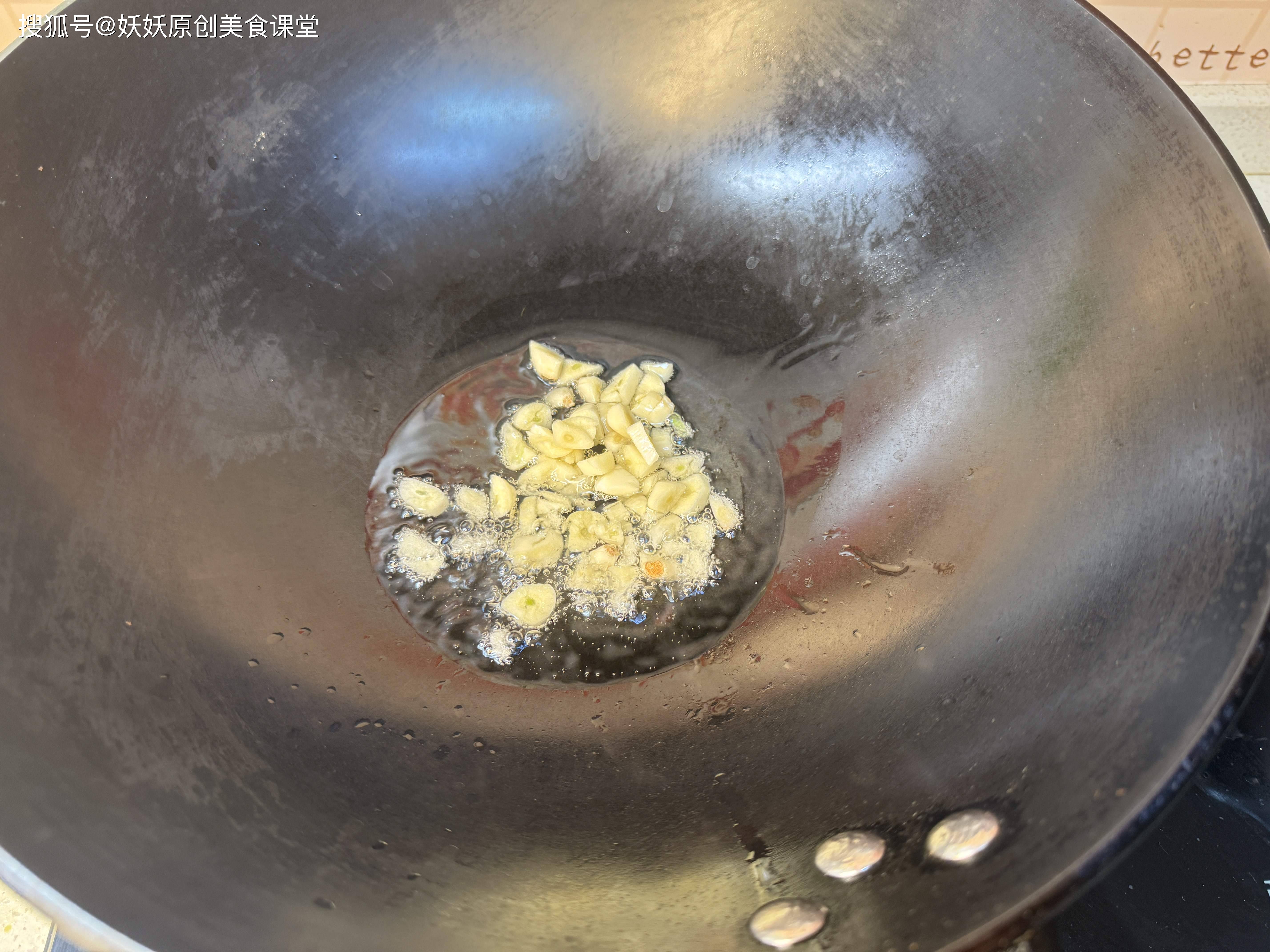 3,油锅烧至五成热,下入蒜末翻炒出香味,蒜的用量别怕多,它的味道跟西兰花是绝配,而且大蒜还有消炎杀菌的功效,搭配西兰花更是功效加倍。