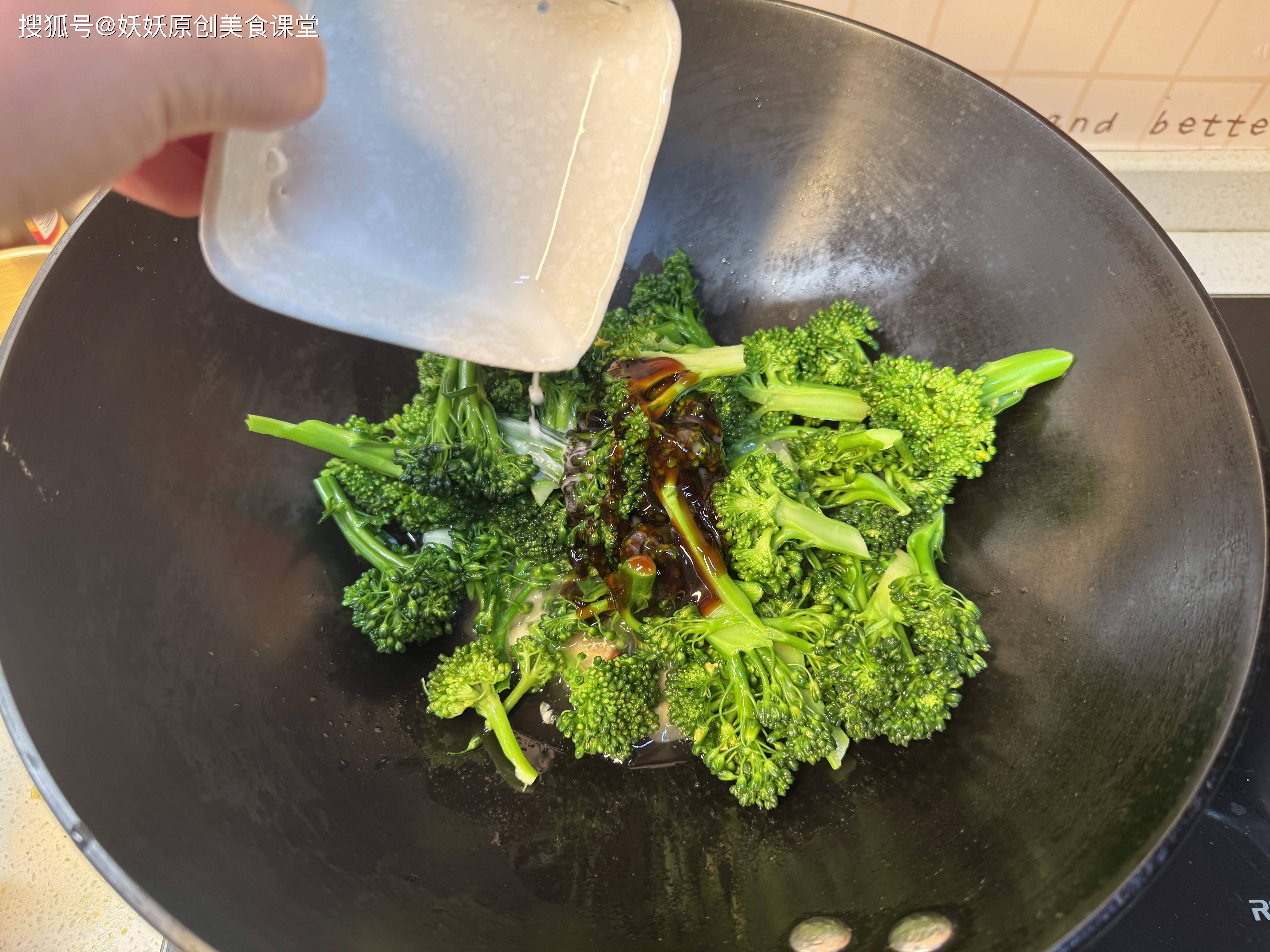 4,然后倒入焯好水的西兰花,来上一大勺蚝油调味,适量的水淀粉勾芡,这样做出来的西兰花颜色和口感都会更好。
