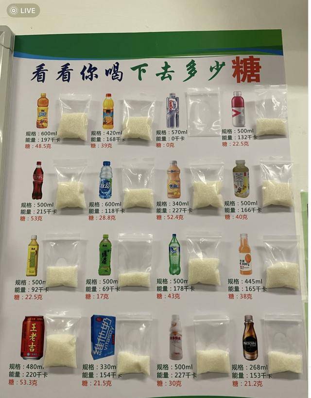 例如超市里动辄 1L 的大瓶装含糖饮料,吨吨吨大口闷掉半瓶。即使是普通份量的一小瓶,喝下去的糖分总量,展示出来也很吓人。