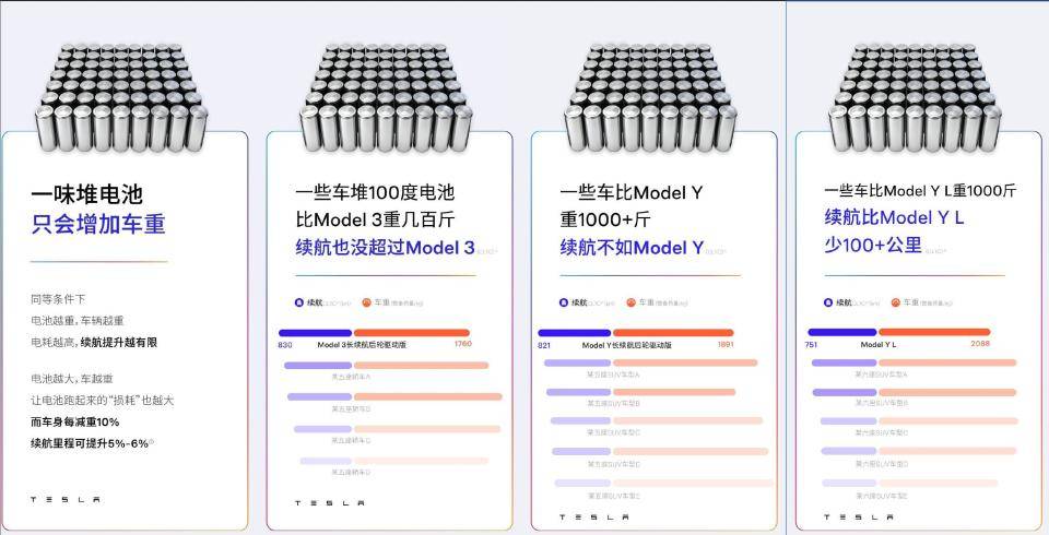 之前一段时间,在国内市场一直表现得“人畜无害”的特斯拉,突然在社交平台上持续“开炮”,核心意思就是很多竞争对手靠堆电池增加续航,“一些车堆100度电池、比Model 3重几百斤,续航也没超过Model 3”、“一些车比Model Y重1000+斤,续航不如Model Y”、“一些车比Model Y L重1000斤,续航比Model YL少100+公里”的表述。虽然在图片中,没有提到具体的车型名称,但是可以看到的是,特斯拉这一次措辞很冲,对友商的嘲讽跃然纸上……