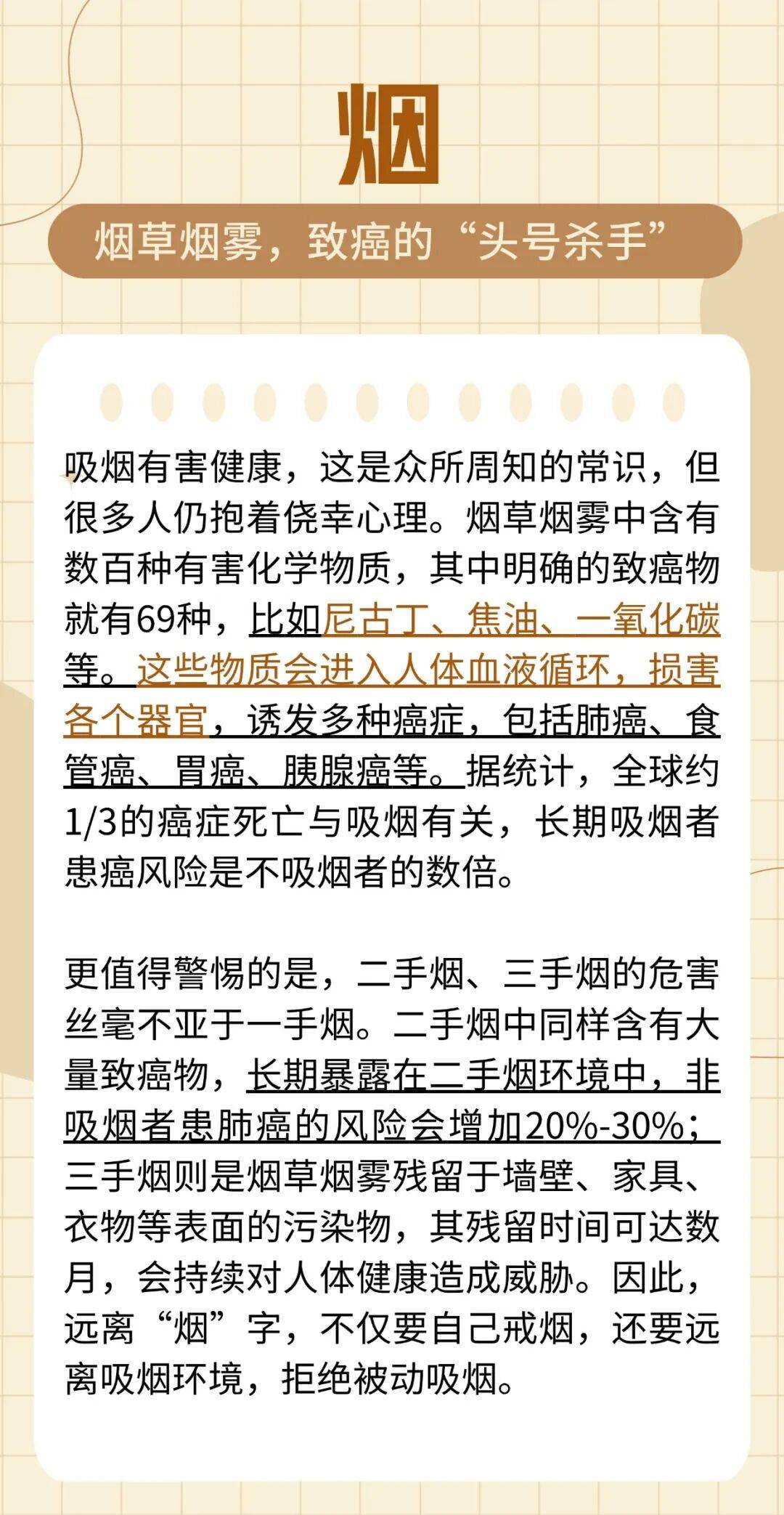 今天,我们就来详细聊聊这8个字,以及如何养成健康的生活习惯,为身体筑牢抗癌防线。 这8个字分别是:烟、酒、焦、腌、霉、油、懒、憋。看似简单的8个字,却暗藏着诸多致癌风险,下面我们逐一拆解。