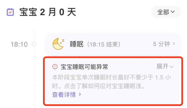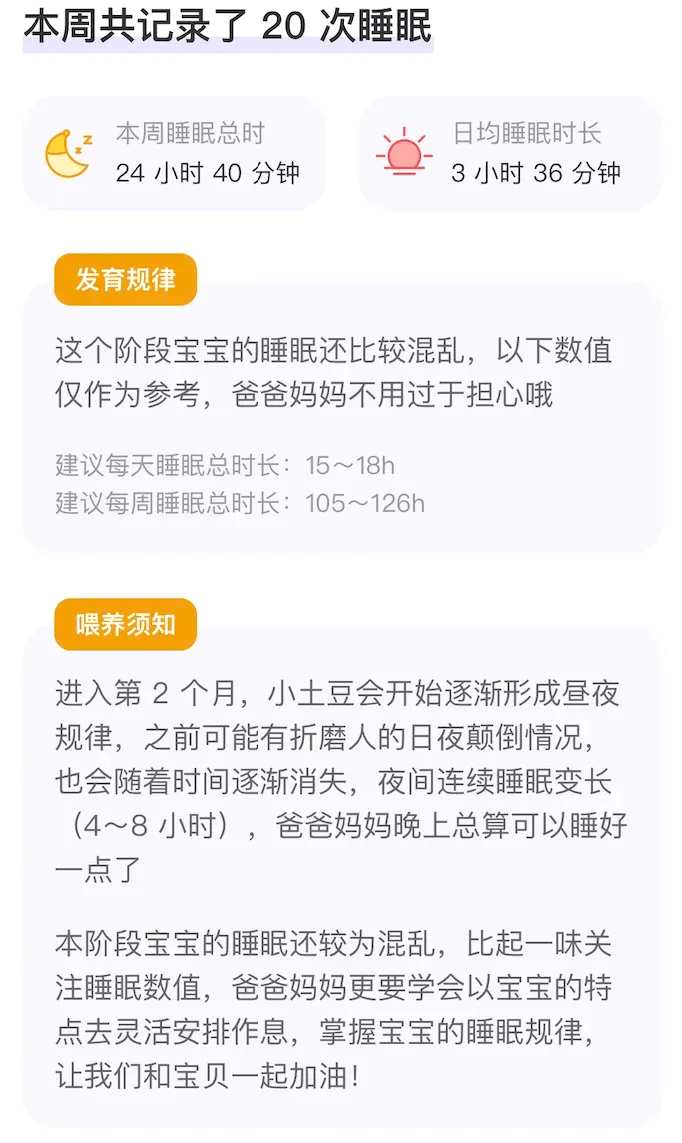 举个例子,当宝宝的睡眠时长少于正常推荐值的时候,就会立马出现一条提醒,告诉爸爸妈妈,当前阶段宝宝应该睡多久,以及应对方法。