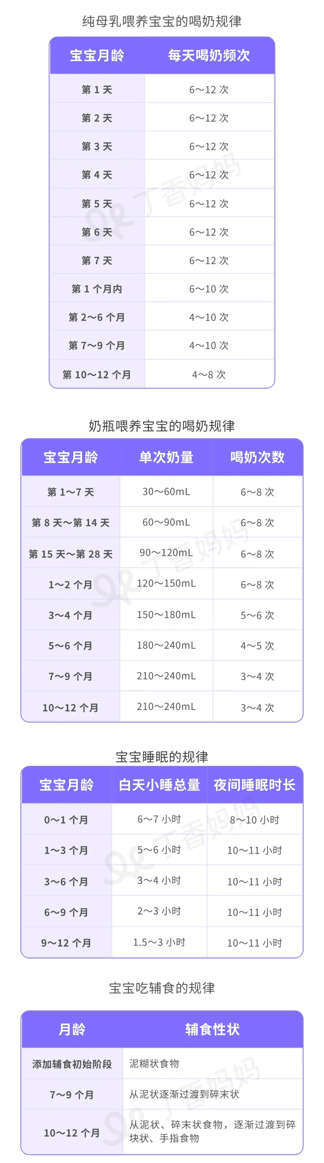 · 当前月龄宝宝的喝奶 / 睡觉 / 便便 / 辅食添加规律