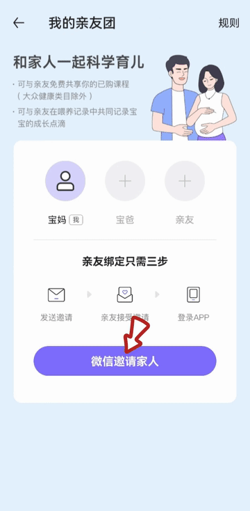 「喂养记录」可邀请家人加入亲友团,无论谁带宝宝(妈妈、爸爸、爷爷、奶奶、外公、外婆),都能随时在「喂养记录」中添加宝宝的吃喝拉撒情况。