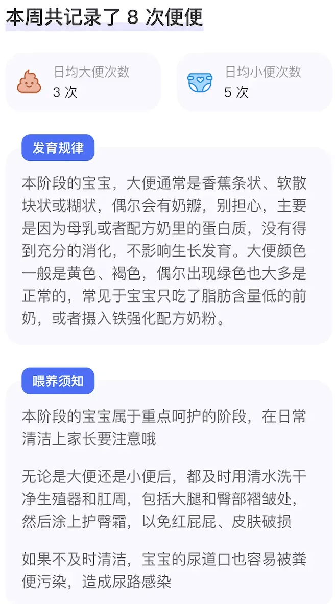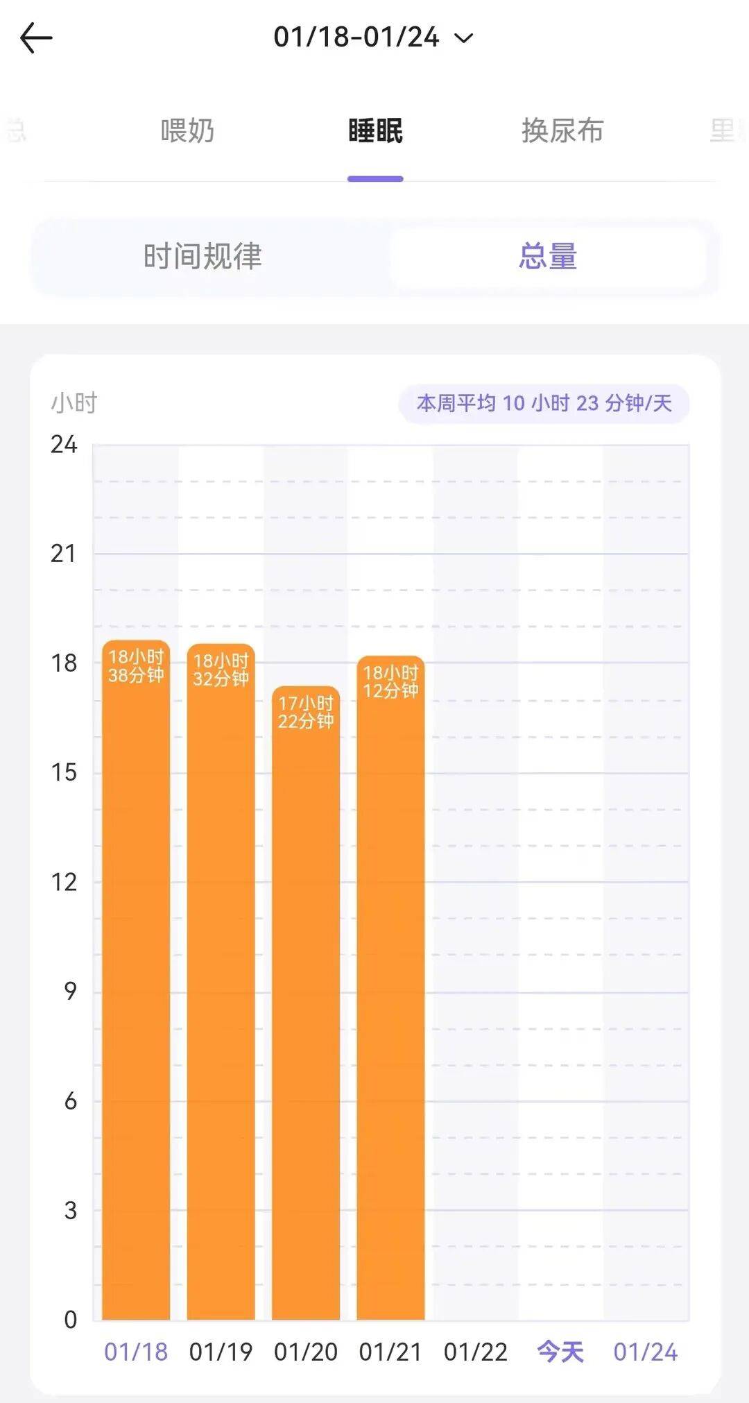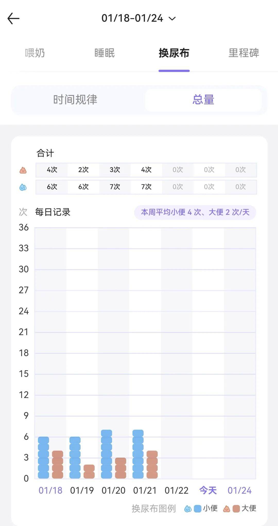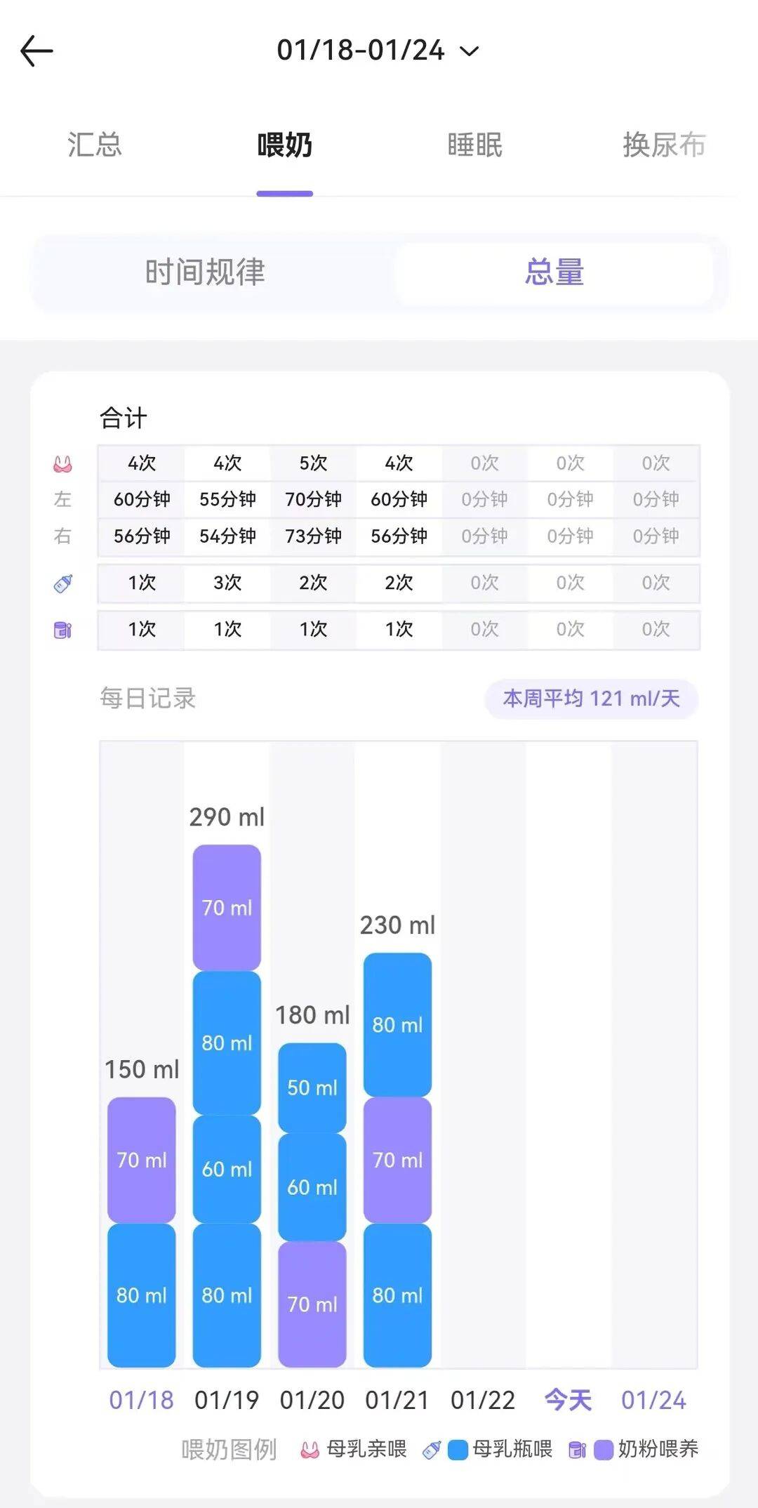 每一条记录,都会自动生成可视化的图表。家长可查看每周 / 每天喂奶、睡眠、换尿布的频次、总量、时间分布规律。