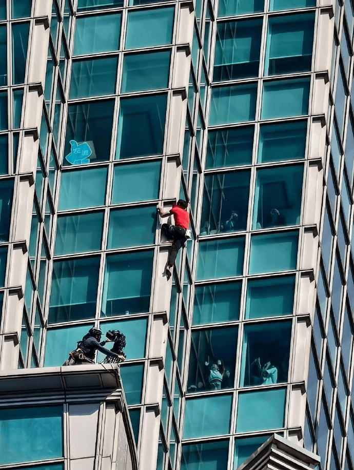 挑战从早上9点开始。10点左右,霍诺德已经爬完五层“竹节”,每爬一层都转身挥手跟民众互动,体能惊人。